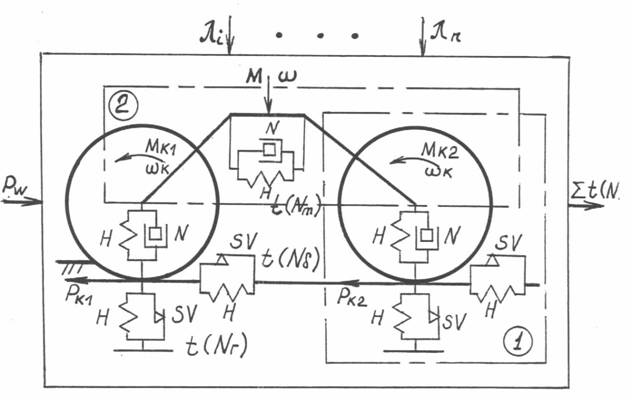 Согласно принципа декомпозиции разделим исследуемую систему на две подсистемы, выделенные на схеме пунктирными линиями. Подсистема 1 включает опорную поверхность и пневматическую шину.