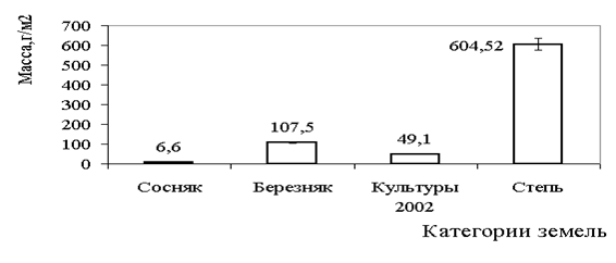 Рисунок 1 - Фитомасса живого наочвенного покрова различных категорий земель Джабык-Карагайского бора