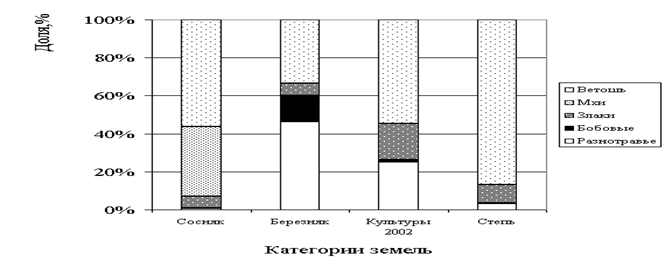 Рисунок 2- Доля агроботанических групп в фитомассе живого напочвенного покрова различных категорий земель Джабык-Карагайского бора