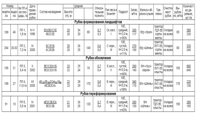 Таксационные показатели и технологии лесосечных работ на опытных объектах представлены в табл.1.