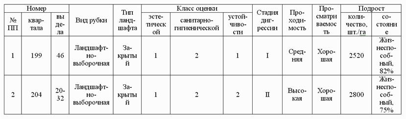 В результате проведения ландшафтных рубок улучшились рекреационные показатели лесных участков (табл.2). Рубками сформированы закрытые пейзажи с полнотой 0,3-0,4.